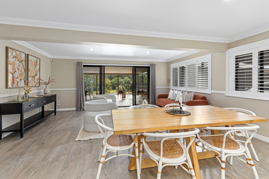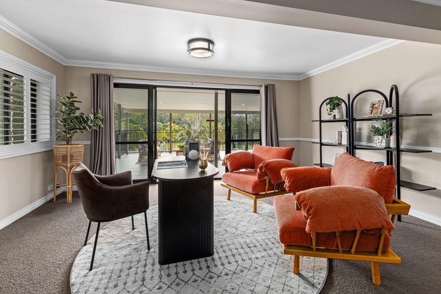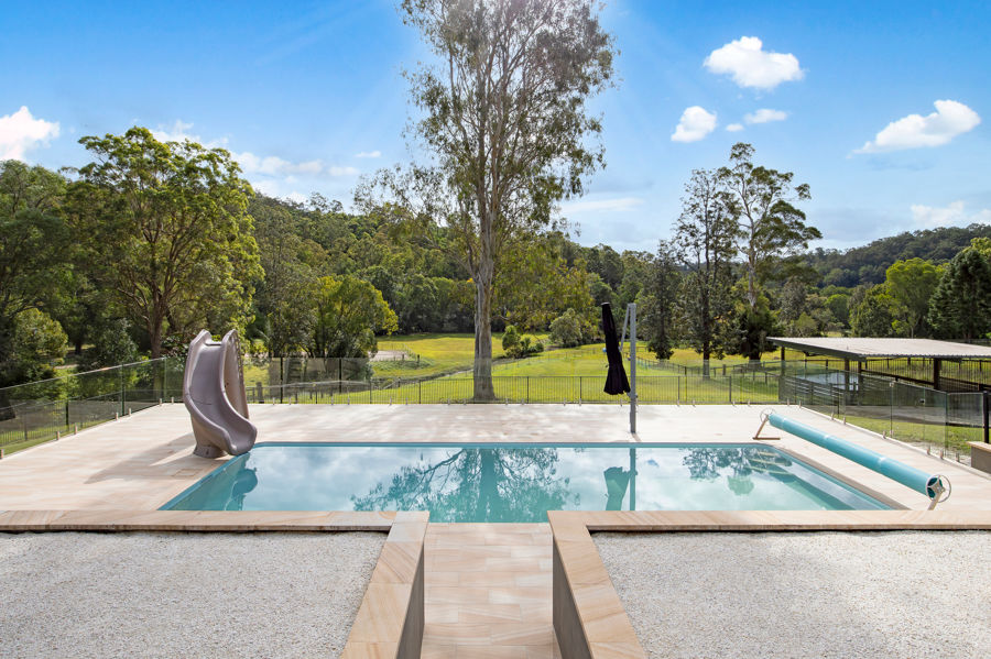 The home also features a generous, north-facing covered outdoor entertaining area, enhanced by views over the green hilltops of the valley and impressive in-ground saltwater pebblecrete pool.